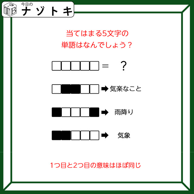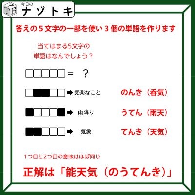 3つの単語の答えは上から「のんき」「うてん(雨天)」「てんき」です。そして正解は「のんき」とほぼ同じ答えになるそうです。