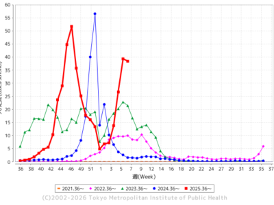 2月5日、東京都はインフルエンザ患者報告数が警報基準を超えたと発表しました。今シーズン2回目の警報です。2月15日までの報告数(図1)ではピークを越えつつあるようですが、依然として高い水準であることは間違いありません。