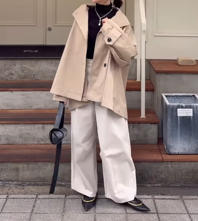 インナーにはブラックのタートルネックを仕込み、首元にパールネックレスを添えることで、膨張しがちな淡色コーデにメリハリと上品さをプラスしています。足元はポインテッドトゥのパンプスできゅっと引き締めれば、カジュアルになりすぎない大人の装いが完成。季節の変わり目に重宝する、軽快なスタイルです。
