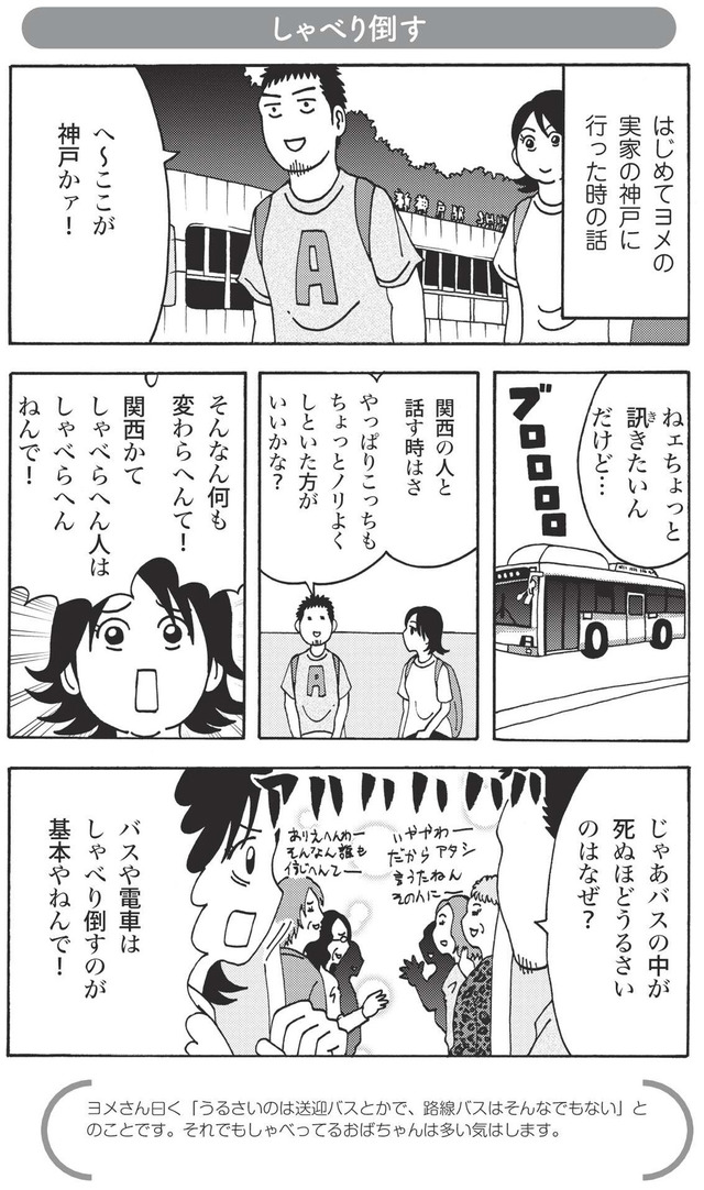 うるさいバスの中、おばちゃんがアメを仕込むコテコテの地・関西出身の妻。
