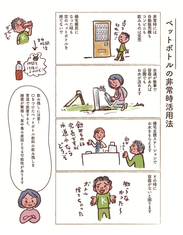 被災したとき重要な課題「水」。資源ゴミで全部のペットボトルを捨てないで!非常時活用法【大切な「いのち」と「お金」を守る マンガ 防災&防犯ブック #13】