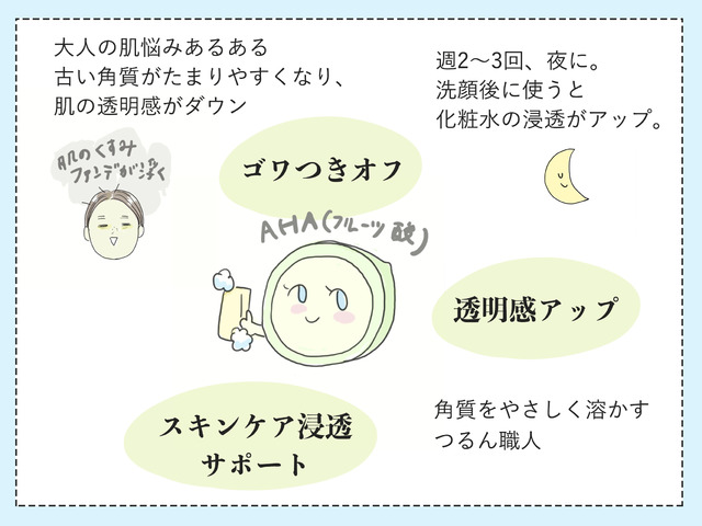 そんな肌にぴったりなのが、AHA(フルーツ酸)。フルーツ由来のやさしい酸が、肌表面の古い角質をゆるめてなめらかに整えてくれる頼れる存在です。
