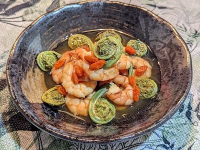 こごみは「肝に貯まる血の熱を冷ましながら、炎症を鎮める」働きが期待でき、えびは「身体に気と熱を補って、腎の機能を助ける」働きが期待できます。春のストレスで肝に熱がこもるとは、肝に貯めている血に熱を帯びていることになります。この時季限定でスーパーに並ぶこごみは「涼性」の食材なので、肝血の熱を取る働きをしますが、血の熱を取り過ぎると身体の不調につながりかねないので、「温性」の食材であるえびと一緒にして温涼のバランスをとっています。