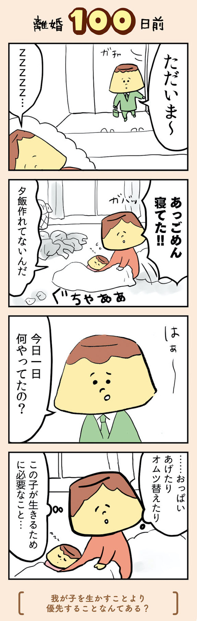 殺意しか湧かない! 2時間かけて赤ちゃんを寝かしつけた後、空気を読めない夫が帰宅【離婚まで100日のプリン1 #3】