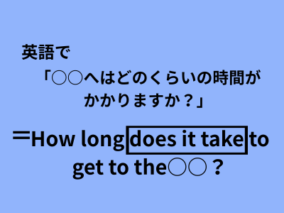 「How long does it take to get to the ○○?」は、toが2回登場したり、takeやgetも出てきたりして、日本人にとっては覚えにくいのですが、知っておくと会話が広がるきっかけにもなります。