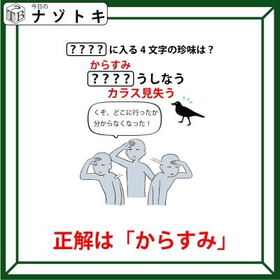 前にいる人はどうやらカラスを探しているようですが、そのカラスは背後にいます。つまり、カラスを見失ってしまったようです。これを当てはまるように言葉を短くすると「カラス見失う」ですね。ここまでくれば分かりますね。