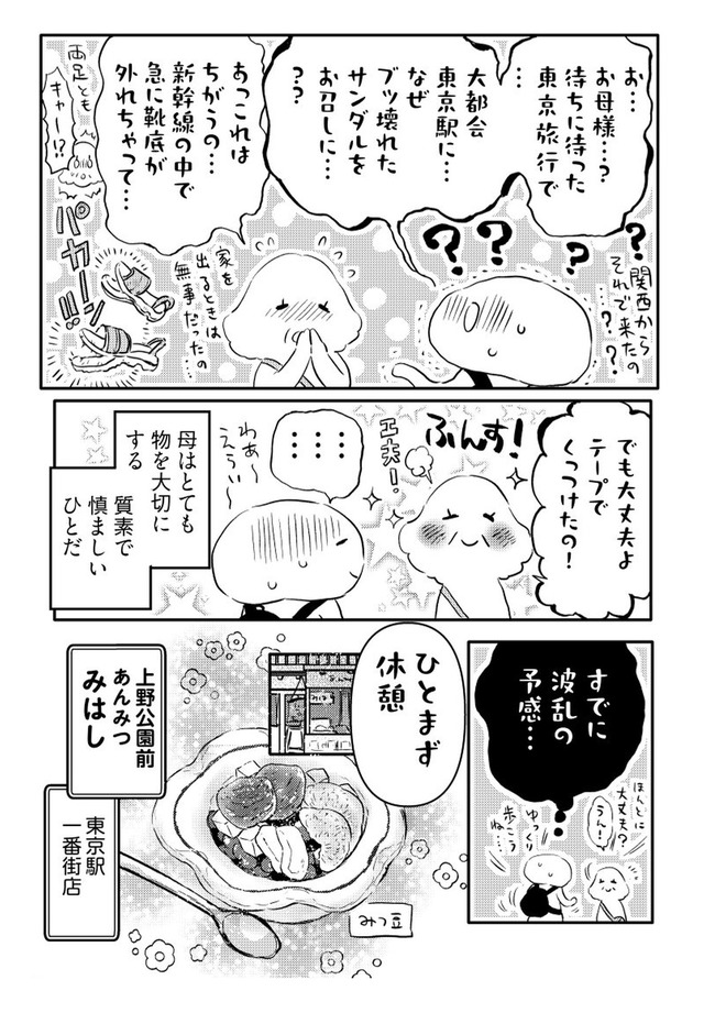 年間に何度も旅する漫画家の“私”が、旅慣れない母を連れて向かったのは関東への二人旅。壊れたサンダルで現れる母に始まり、行く先々でハプニング続出。