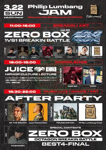 名称:Philip Lumbang JAM(Step Into The 5th Elements of HIPHOP)開催日:2026年3月22日(日)会場:SLOTH JINNAN(東京都渋谷区神南1-14-7)主催:Philip Lumbang/ハワード株式会社協力:FOUND NATION https://www.instagram.com/foundnation_officialFNMD ltd. https://www.fnmd-ltd.comROOTS https://www.instagram.com/roots_daytodaySPIN CONTROL https://www.instagram.com/thespincontrol