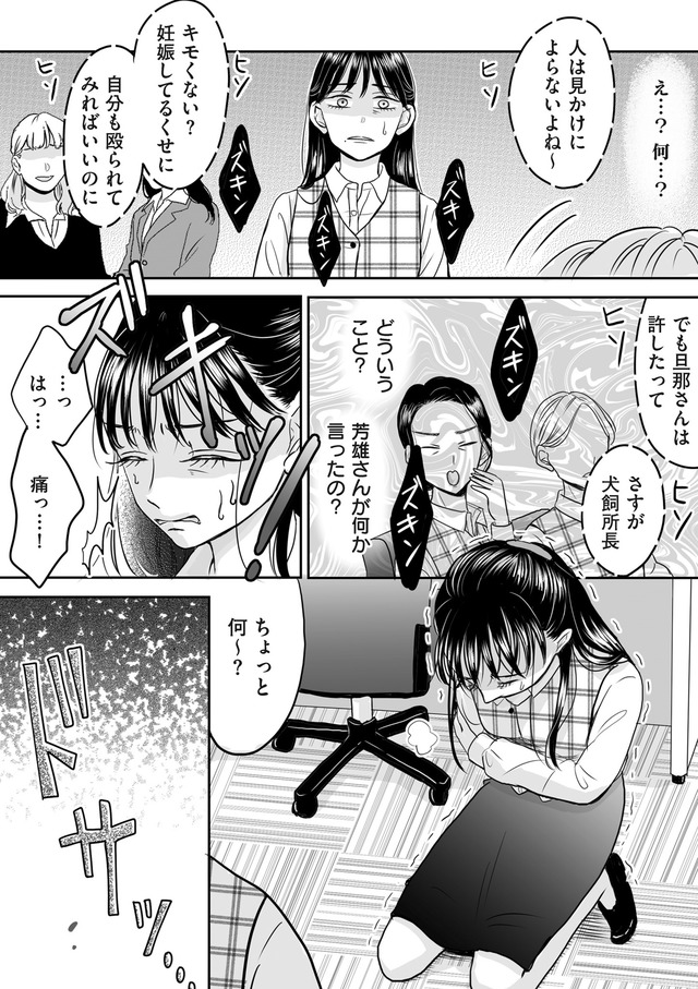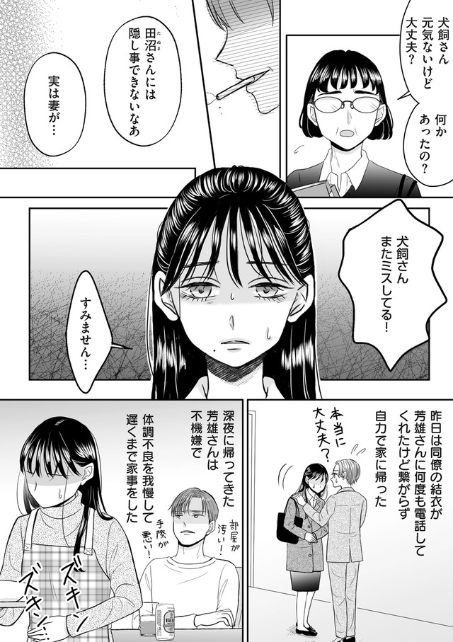 社内でも評判のエリート芳雄と結婚した安枝だが、夫からDVを受けたストレスで流産してしまう。