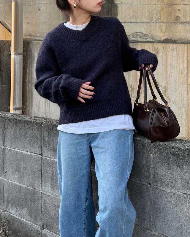 色の組み合わせを工夫するだけで、いつものデニムスタイルがぐっと洗練されます。miki__uchikoshiさんは、ZARAのVネックセーターを主役に、ネイビーとブラウンの落ち着いた配色を披露。首元から白Tシャツをのぞかせるレイヤード術で、顔周りに明るさと抜け感をプラスしています。ゆるっとしたワイドデニムを合わせつつ、重厚感のあるロングコートを羽織れば、リラックスした雰囲気に。