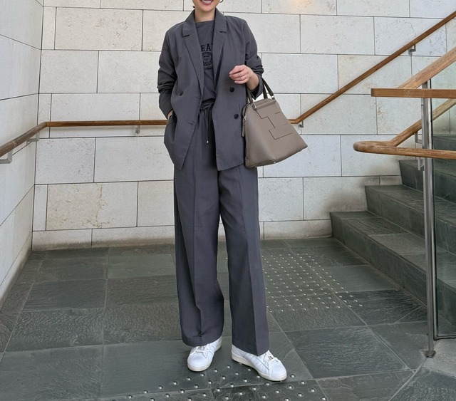 コーディネートに迷う朝、頼りになるのが統一感の出るセットアップです。maico0327さんは、チャコールグレーのダブルテーラードジャケットとパンツを合わせた装いを披露。シアー感のある軽やかな素材は、接触冷感機能付きでこれからの季節に心地よく、洗濯機で洗える扱いやすさも魅力です。