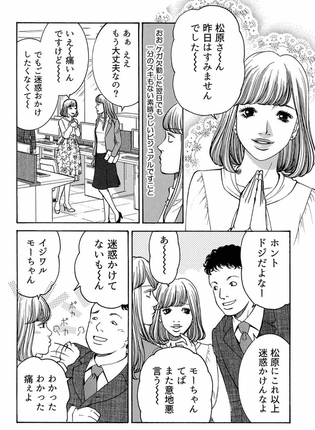 怪我で休んだ翌日もメイクに隙なし!男性社員の前でドジっ子を演じる後輩女子に女性陣ドン引き…【社内探偵 #3】