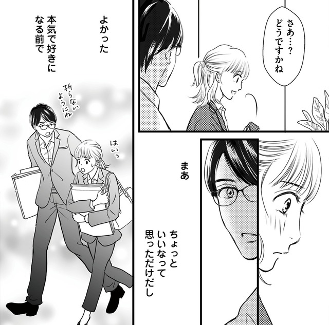 彼に家庭があると知り一度は思いを断ち切ろうと決意するが、彼がこぼした「妻に会う前に君に出会っていたら…」という言葉に心が大きく揺れ動く。
