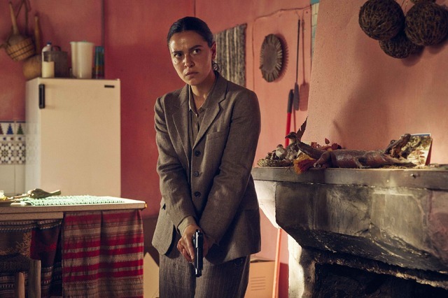 5枚目は、メイ・キャラマウィが演じるカイロ警察の捜査官ザキが、物語の鍵となる家を捜査している場面。拳銃を手にしたザキは神経を研ぎ澄ませて周辺を伺っているが…。
